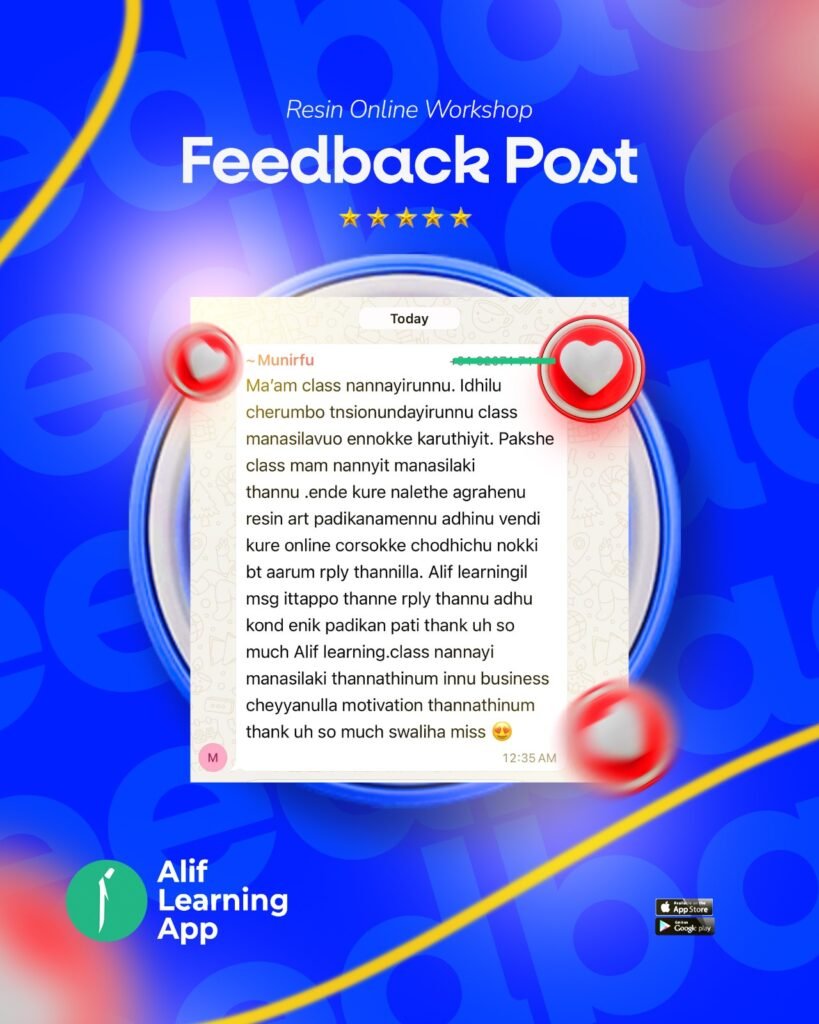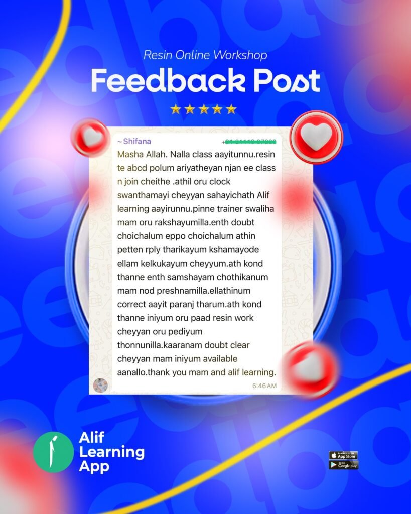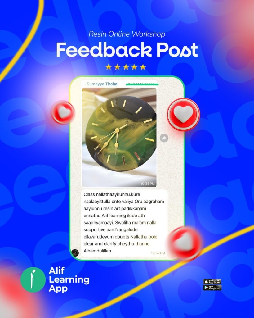 Resin art പഠിക്കാൻ ആഗ്രഹം ഉണ്ടെങ്കിലും ഓരോ മാസവും fee അടയ്ക്കേണ്ടി വരുമോ എന്ന ഭയം ഉണ്ടോ? പലരും ആവേശത്തോടെ art / craft class‑ൽ join ചെയ്യാറുണ്ട്, പക്ഷേ monthly fee അടക്കേണ്ടി വരുന്നത് കൊണ്ടാണ് അധികംപേരും ഇടയിൽ തന്നെ ക്ലാസ് നിർത്തേണ്ടി വരുന്നത്.അത്തരം situation ഒന്നും ഇല്ലാതിരിക്കാനാണ് Alif Resin Art Mastery course specially design ചെയ്തിരിക്കുന്നത്.